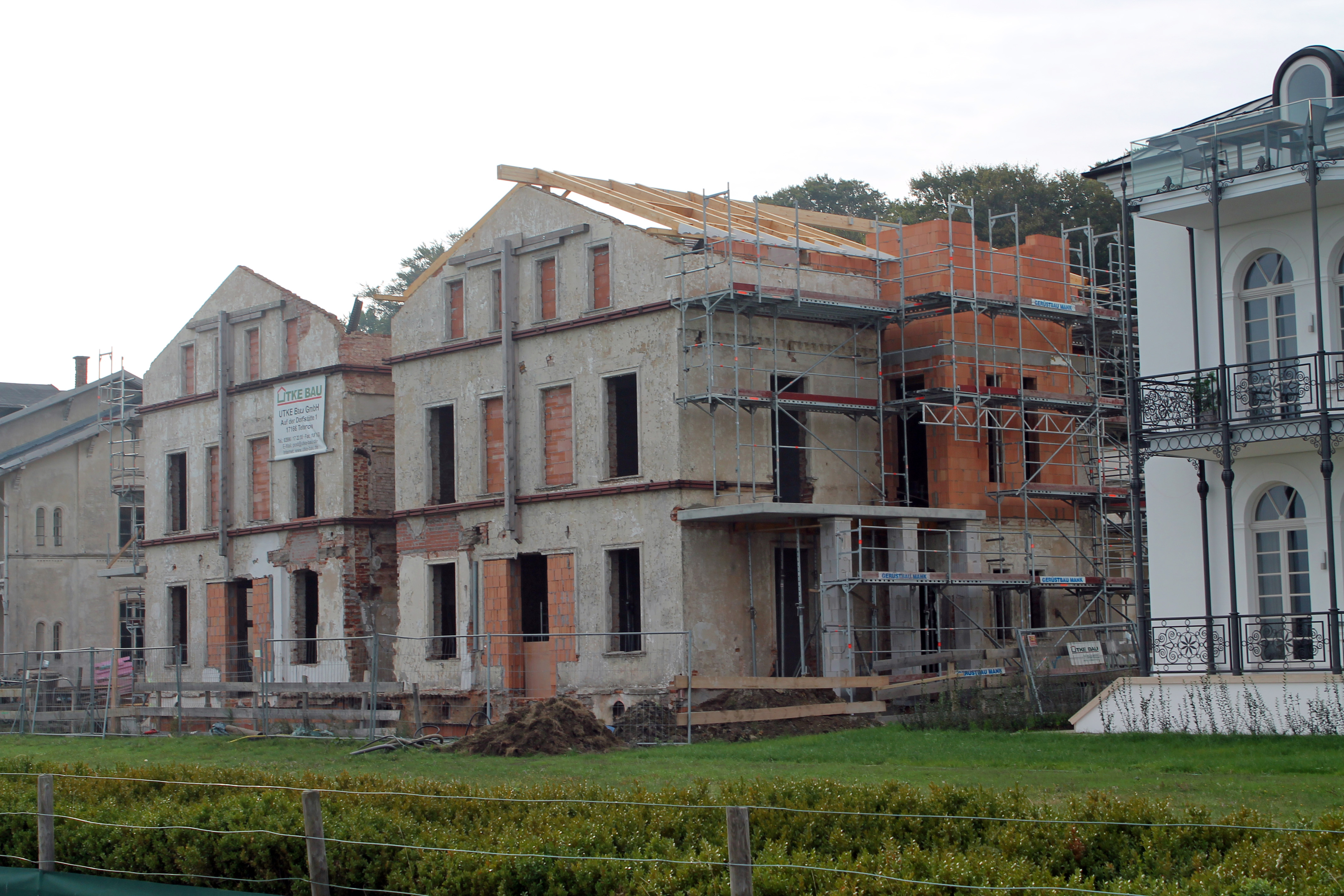 Einige Arbeiter verbrachten heute ihre Frühstückspause auf den Balkonen der Villa „Möwe“ und genossen den Blick auf die Ostsee bei schönem Sonnenschein. Auf dem Dach zog einer die Folie vom Dach und im Außenbereich war einer mit dem Spaten zu Gange. Nebenan Baulärm: Motoren von Baggern und Radladern, Hämmern und Rufen. Die Villa „Seestern“ trägt schon die ersten neuen Dachbalken auf ihren alten historischen Mauern.