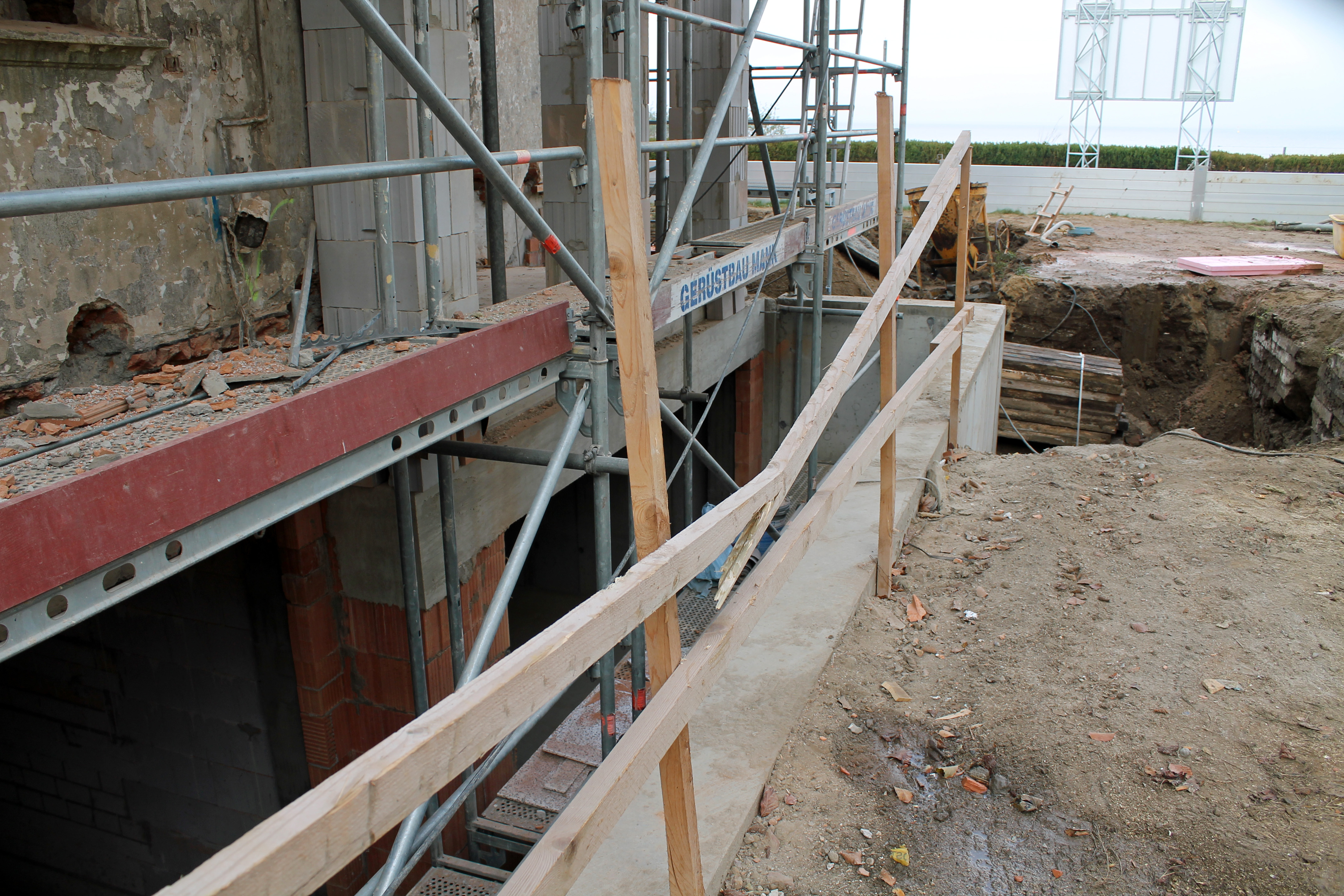 Die Villa wurde auf Stützen gestellt und stand wochenlang quasi in der Luft. Das Kellergeschoss wurde im Gussverfahren mit Beton unter das Haus gegossen. Dazu gab es hinter der Villa ein eigenes Mini-Betonwerk mit eigener Stromversorgung vom Aggregat. Von der Promenade aus sah man nur etwas vom Wachstum des Hauses nach unten, wenn man ganz genau hinsah. (Siehe: Bilder vom Richtfest)