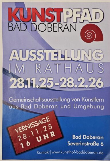 Veranstaltungsarchiv Ausstellung im Rathaus – Kunstpfad Bad Doberan (28.11.2025-28.02.2026) 25. 11 2025 Martin Dostal 0 Diesen Beitrag teilen:teilen teilen teilen teilen teilen merken teilen teilen teilen RSS-feed teilen E-Mail drucken spenden Teilen mit: Auf Facebook teilen (Wird in neuem Fenster geöffnet) Facebook Auf X teilen (Wird in neuem Fenster geöffnet) X Porträt-Ausstellung Autismus im Rathaus (ab 12.04.2025)Datum11. 04 2025In Bezug aufVeranstaltungsarchivKunsthandwerkermarkt im Rathaus (25.-26.10.2025)Datum16. 10 2025In Bezug aufVeranstaltungsarchivTauschparty im Rathaus Bad Doberan (14.03.2026)Datum7. 03 2026In Bezug aufVeranstaltungsarchivAnzeige