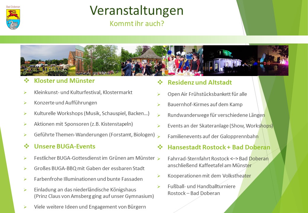 Bad Doberan soll sich als BUGA-Außenstandort für die BUGA 2025 in Rostock bewerben. Das verkündete Bad Doberans Bürgermeister Jochen Arenz im Frühjahr in den sozialen Medien und sammelte sogleich Ideen.