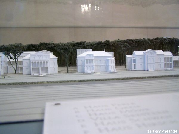 Aktuell gibt es einige Streitigkeiten, weil Stadtvertreter Harry Klink befürchtet, das Gebäude könne zu hoch werden und das Gesamtbild stören. Genau das hatte ich mir 2010 auch gedacht, als ich dieses Foto vom Modell anfertigte. Doch ich fotografiere hier quasi mitten von der Ostsee aus auf einer Höhe, als würde ich auf einer Seebrücke stehen, die es dort nicht gibt. Von der vorhandenen Seebrücke kann man schon die Villen „Schwan“ und „Hirsch“ kaum sehen, weil sie eingerückt sind. Schwarze Dächer verschwinden vor dunklem Wald. Von der Promenande aus schaut man in einem Winkel auf die Villen, der schon die vorhandene Bebauung an der Südseite hinter den Villen verschwinden lässt. Vom Strand verschärft sich das noch, weil man von unten auf das Ensemble schaut. Lediglich von Drohnen aus kann man mit Geschick den richtigen Winkel finden, um eine Überragung so sichtbar zu machen, wie ich hier durch Hocken vor dem Modell.