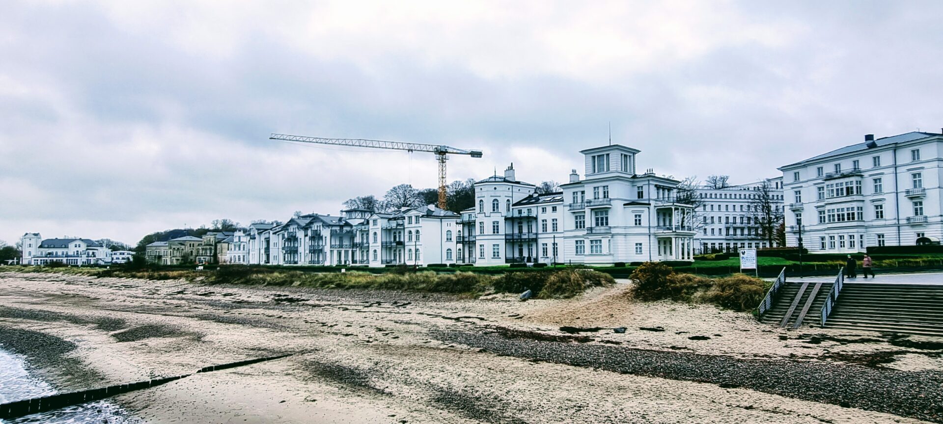 Und so darf man doch mit Zufriedenheit auf dieses Bild der wieder ein Stück mehr Weißen Stadt am Meer werfen. Von der öffentlichen Promenade oder dem öffentlichen Strand aus oder wie hier von der öffentlichen Seebrücke oder bei öffentlichen Führungen, die auch einen kleinen Einblick geben, den man aber auch haben kann, wenn man an Veranstaltungen des Grand Hotels teilnimmt, ins SPA oder einfach einen Kaffee trinken geht. Denn – abgesehen von Corona – ist all das möglich.