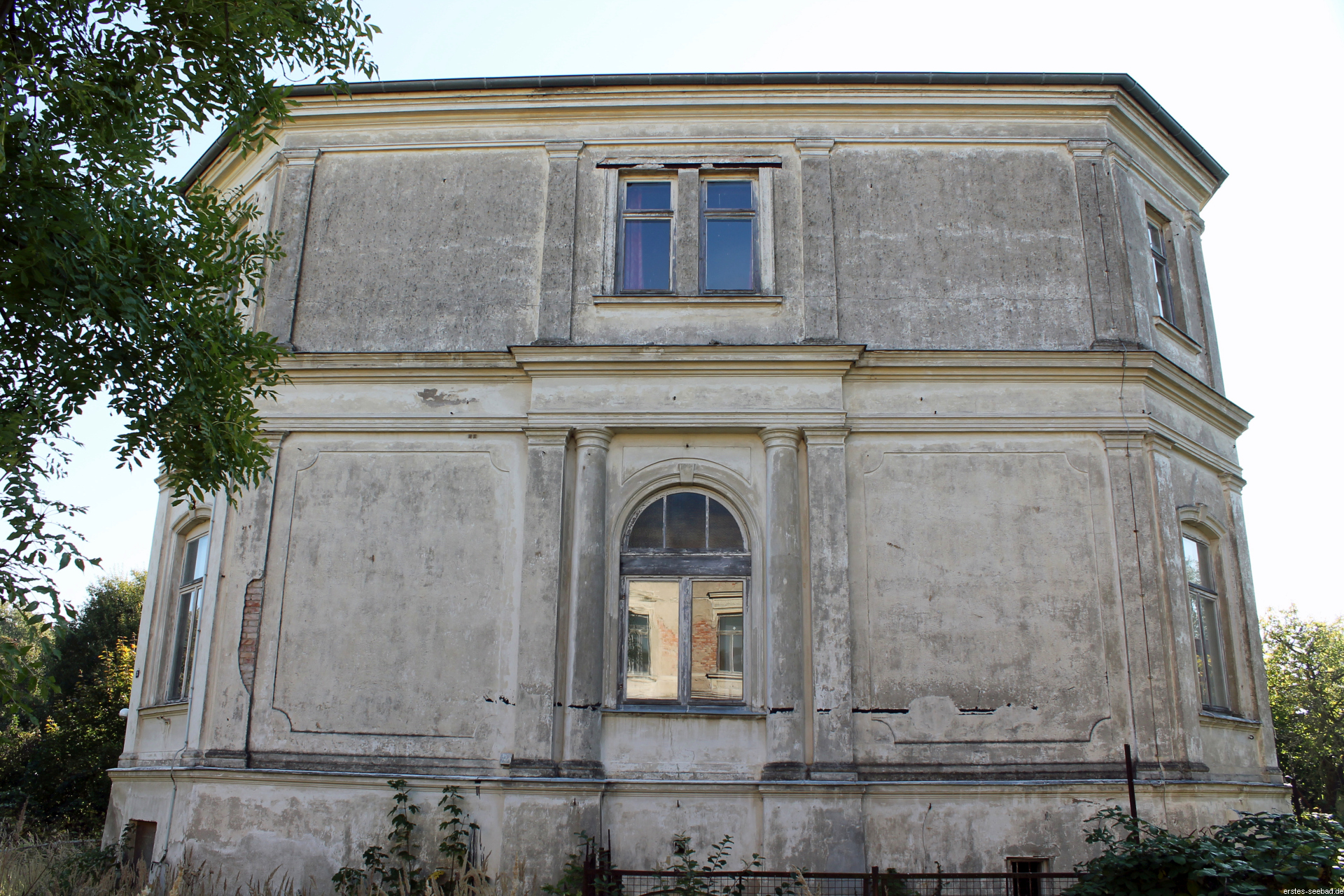 Die nach Westen zeigenden Ecken sind abgewinkelt, sodass die einzige Achse an der Westseite nicht verloren wirkt. Die Ecken sind jeweils einachsig und mit Pilastern betont. Im Erdgeschoss wurden Rundbogenfenster verwendet, jedoch mit flacheren Bögen.
