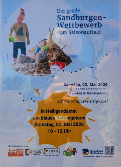 Veranstaltungen Das große Buddeln: Sandburgenwettbewerb in Heiligendamm (02.05.2026) Martin Dostal 0 Diesen Beitrag teilen:teilen teilen teilen teilen teilen merken teilen teilen teilen RSS-feed teilen E-Mail drucken spenden Teilen mit: Auf Facebook teilen (Wird in neuem Fenster geöffnet) Facebook Auf X teilen (Wird in neuem Fenster geöffnet) X Gefällt mir:Gefällt mir Wird geladen … Ähnliche Beiträge