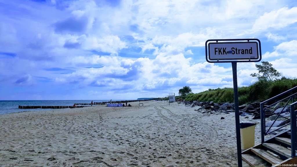 Rechts befindet der FKK-Strand. Hier darf nackt gebadet werden. Der Bereich ist nicht so stark von Strandwanderern frequentiert, sodass FKK-Fans hier etwas unter sich sind. Allerdings sollten sie auf das Schild achten: Der Sportstrand gehört nicht mehr zum FKK – hier wird textil gebadet. Der Strand ist breit und feinsandig, es gibt fast keine Steine.