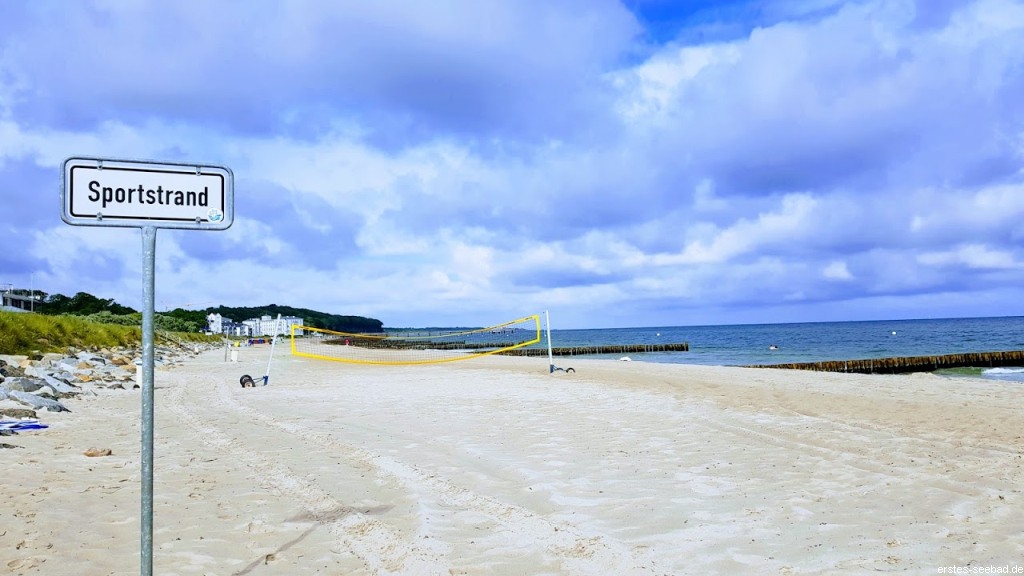 Links geht es zum Sportstrand, auf dem im Sommer Volleyballnetze zum Beachvolleyball einladen. Der Abschnitt eignet sich darum nicht unbedingt zum erholsamen Baden, wohl aber zur körperlichen Betätigung. Auch Beach-Fußball (Beach-Soccer) kann hier gespielt werden. Surfen und Kiten ist hier nicht erlaubt, aber dafür ist die Badeinsel von hier aus gut erreichbar.