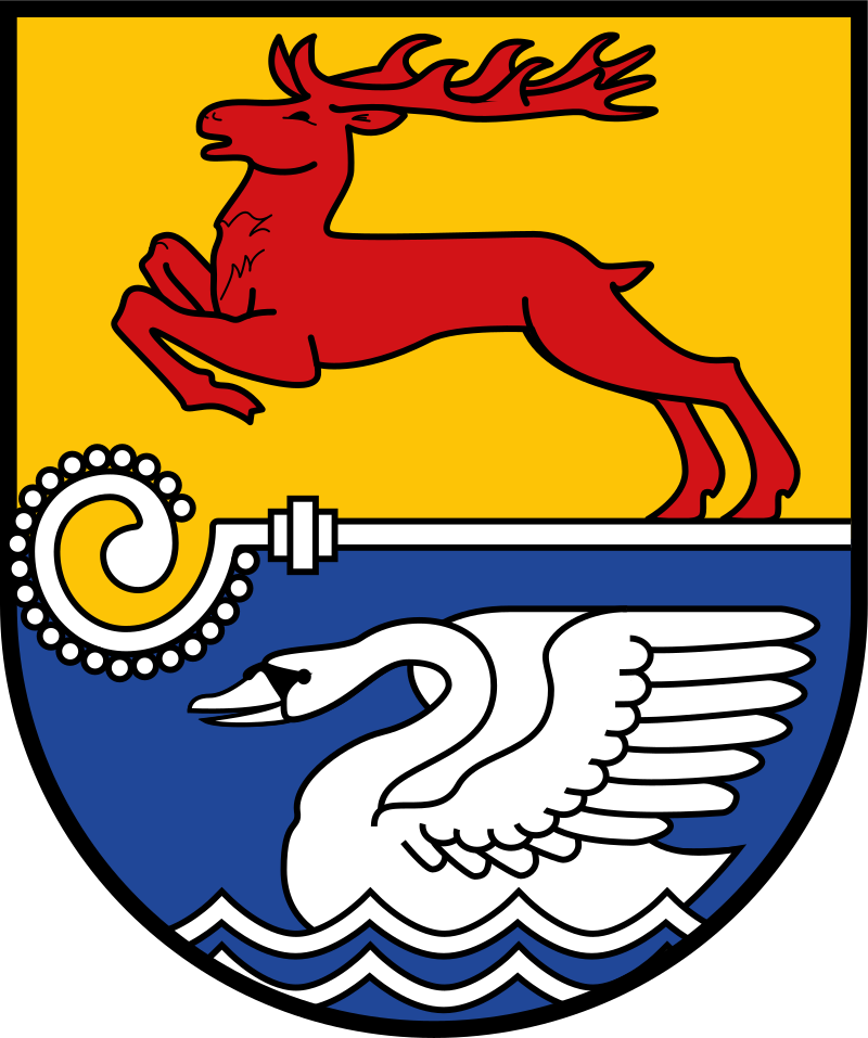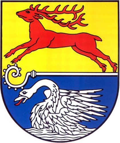 „Durch einen silbernen Krummstab mit nach vorn und aufwärts gerichteter Krümme geteilt; oben in Gold ein springender roter Hirsch mit gestreckten Vorderläufen; unten in Blau ein flugbereiter silberner Schwan mit ausgeschlagener roter Zunge auf silbernen Wellen.“