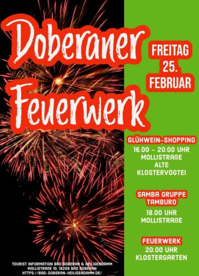 Am Freitag, den 25.02.22 lädt die Stadt Bad Doberan zum Glühwein-Shoppen mit anschließendem Höhenfeuerwerk. Auch ein wenig Karnevals-Gefühl ist dabei, wenn am Faschings-Freitag der DKK für Stimmung sorgt.