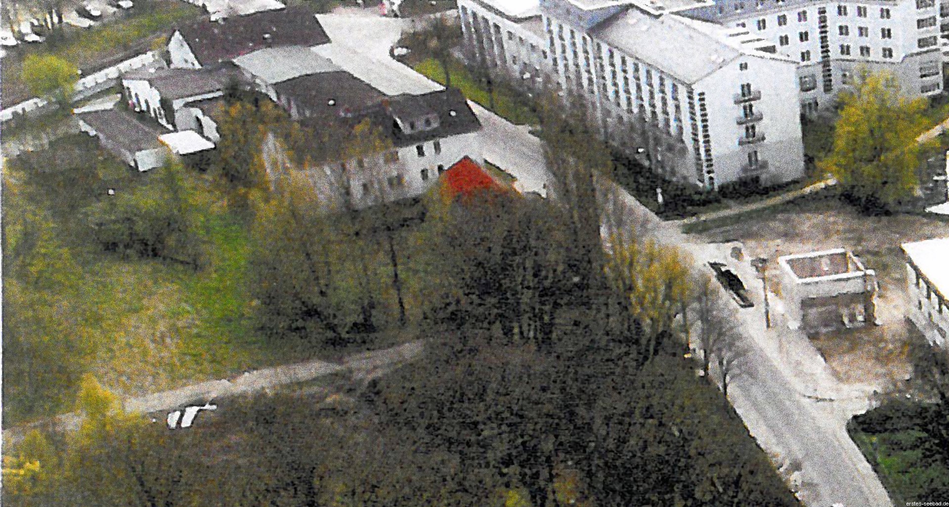 Freifläche zwischen Grand Hotel und Bahnhof (Marstall, Straßenscheune, Fachwerkhaus, „Palette“)