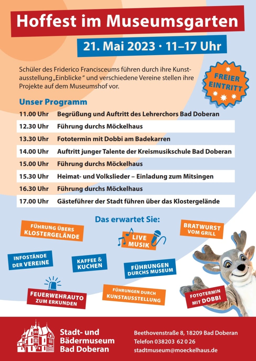 Im Stadt- und Bädermuseum „Möckelhaus“ in Bad Doberan wird, wie bereits im vergangenen Jahr, ein buntes Fest im Museumsgarten gefeiert. Neben einem vielfältigen Bühnenprogramm bekommen verschiedene Vereine wieder die Möglichkeit ihr Projekt dem Publikum am jeweiligen Stand zu präsentieren. Der Geschichts- und Museumsverein grillt und versorgt die Besucher mit Getränken.