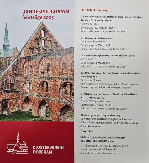 Veranstaltungsarchiv Klosterverein Bad Doberan – Jahresprogramm Vorträge 2025 2. 05 2025 Martin Dostal 0 Diesen Beitrag teilen:teilen teilen teilen teilen teilen merken teilen teilen teilen RSS-feed teilen E-Mail drucken spenden Teilen mit: Auf Facebook teilen (Wird in neuem Fenster geöffnet) Facebook Auf X teilen (Wird in neuem Fenster geöffnet) X Vortrag des Klostervereins in der Aula des Gymnasiums (06.11.2025)Datum1. 11 2025In Bezug aufVeranstaltungsarchiv14. Doberaner Klostermarkt (14.-15.06.2025)Datum22. 05 2025In Bezug aufVeranstaltungsarchivStadtfest Bad Doberan (25.-29.06.2025)Datum21. 06 2025In Bezug aufVeranstaltungsarchivAnzeige