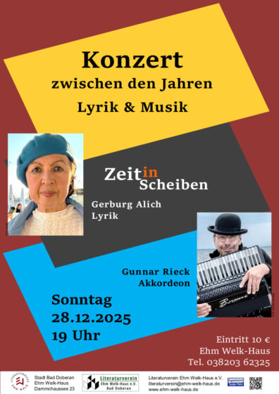 Die Weihnachtstage sind vorüber und die Feierlichkeiten zum Jahreswechsel stehen bevor. Gerade die richtige Zeit für einen entspannten Abend im Ehm Welk-Haus mit Lyrik und Musik von Gerburg Alich und Gunnar Rieck.