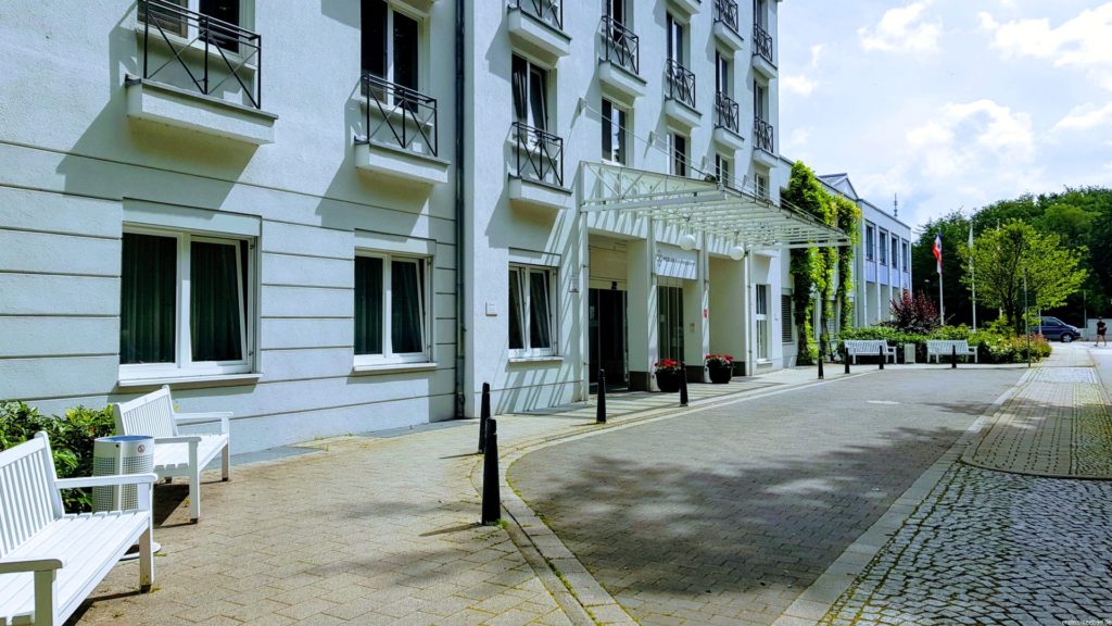 Die Lieferzufahrt zum Grand Hotel war damals noch nicht geplant. Ursprünglich sollte das Versorgungsgebäude des Grand Hotels hinter den Villen der „Perlenkette“ entstehen, aber die Stadtvertreter erteilten diesem Standort eine Absage, sodass das Versorgungsgebäude hinter den Cottages direkt neben der Klinik entstand. Die Median-Klinik bekam außer dem Lagerplatz auch mit einem Wohnhaus und einer Scheune bebaute Grundstücke. Diese wurden abgerissen.