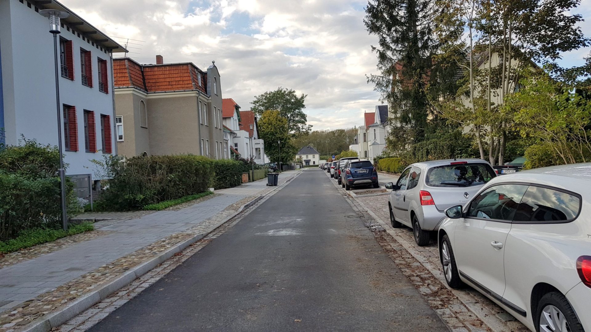 Bei der Sanierung wurde auch der unbefestigte Teil der Feldstraße mit einbezogen. Die Parkmöglichkeiten an der Westseite sind komplett verschwunden und an der Ostseite wurden sie reduziert. Auch entlang der Heinrich-Heine-Straße selbst gibt es nun zwar feste Parkplätze, aber weniger Parkmöglichkeiten.