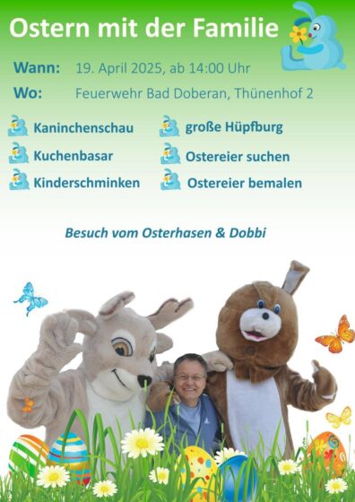 Veranstaltungsarchiv Ostern mit der Familie bei der Feuerwehr Bad Doberan (19.04.2025) 14. 04 2025 Martin Dostal 0 Diesen Beitrag teilen:teilen teilen teilen teilen teilen merken teilen teilen teilen RSS-feed teilen E-Mail drucken spenden Teilen mit: Auf Facebook teilen (Wird in neuem Fenster geöffnet) Facebook Auf X teilen (Wird in neuem Fenster geöffnet) X Ostern mit der Familie (04.04.2026)Datum7. 03 2026In Bezug aufVeranstaltungsarchivOSTERN IN DOBERAN mit Dobbi und dem Osterhasen (08.04.2023)Datum4. 04 2023In Bezug aufVeranstaltungsarchivOsterfeuer 2019 in Bad Doberan, Heiligendamm und AlthofDatum18. 04 2019In Bezug aufVeranstaltungsarchivAnzeige