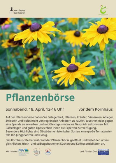 Veranstaltungen Pflanzenbörse am Kornhaus Bad Doberan (18.04.2026) Martin Dostal 0 Diesen Beitrag teilen:teilen teilen teilen teilen teilen merken teilen teilen teilen RSS-feed teilen E-Mail drucken spenden Teilen mit: Auf Facebook teilen (Wird in neuem Fenster geöffnet) Facebook Auf X teilen (Wird in neuem Fenster geöffnet) X Gefällt mir:Gefällt mir Wird geladen … Ähnliche Beiträge