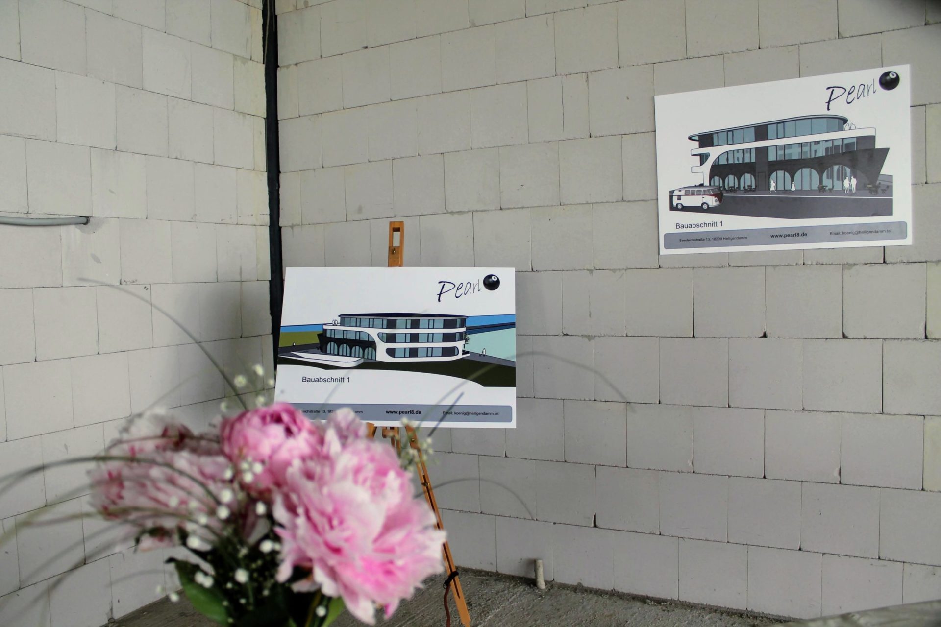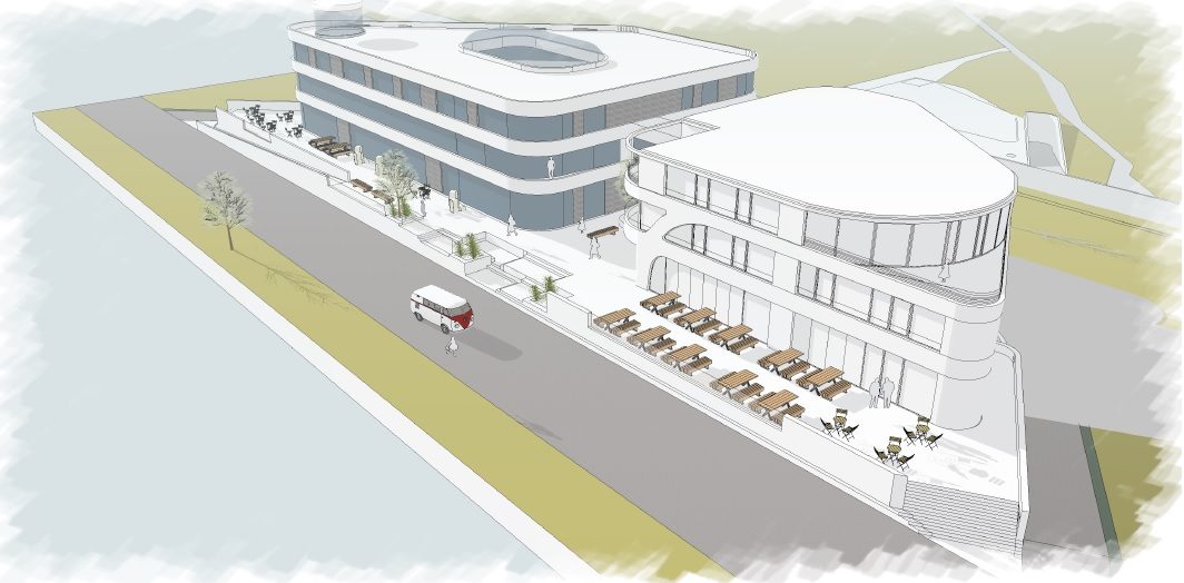 König kann seinen Unmut nicht verbergen. Er zeigt die Fläche, in der eine Gaststätte entstehen soll. Sie ist riesig, nimmt allein gut ein Drittel des Geschosses ein. Gleich links ist Platz für einen großzügigen Küchenbereich und auch weitere Räume sind nach hinten hin möglich. König hat nur die wichtigsten Wände bauen lassen – den genauen Grundriss entwickelt er zusammen mit denen, die die Flächen nachher nutzen wollen. Ein tortenstückförmiger Gastraum erstreckt sich nach der Passage der Tür. Aus den hohen Fenstern und von der noch nicht vorhandenen Terrasse davor geht der Blick auf den Deich und wenn er nicht bewachsen wäre, gäbe es sogar Seeblick. Das Blau der Ostsee schimmert durch die Büsche, die man in Schleswig-Holstein und Niedersachsen niemals auf einen Deich pflanzen würde. Schon 2004 zeigte die ECH mit einem Entwurf von Hass & Briese, was man hier machen könnte: