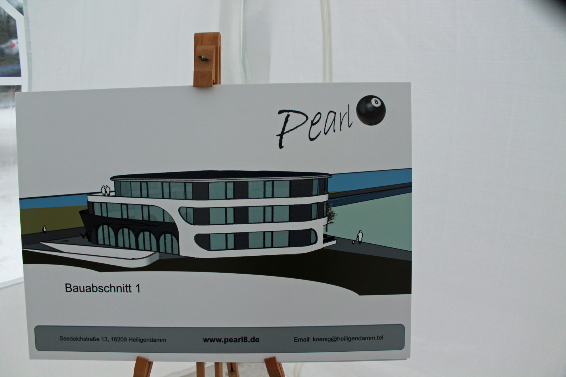 Für den Abstand brauchte Klaus König gar nicht zu sorgen – die kühle Distanz war im Raum geradezu zu spüren. Hier die Leute, die Pearl 8 geplant haben und bauen und dort die Gäste. Der Bürgermeister stellte sich zu ersteren dazu, ging dann aber nach einiger Zeit doch zu denen, mit denen er gekommen war. Die Rede Klaus Königs war kurz. Er sagte, er hat sein Wort gehalten, stellte einige Leute vor, bedankte sich und erklärte die Farbgebung der Richtkrone. Nicht schwarz, wie die Farbe der Billardkugel mit der Acht, sondern gold-weiß wehten die Bänder und war auch der Weg dorthin geschmückt. Die Eltern von Königs Lebensgefährtin hatten Goldene Hochzeit an diesem Tag und er widmete das Richtfest dem Goldenen Paar.