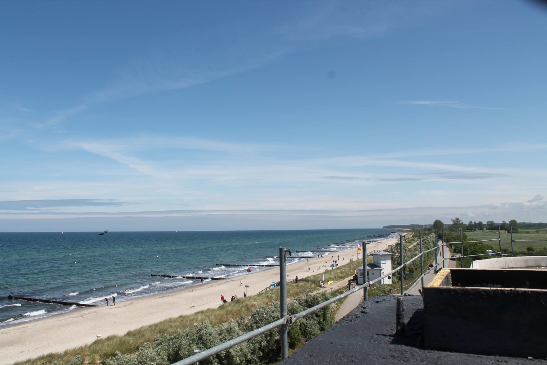 Diese Aussicht – dort die Weiße Stadt am Meer, dahinter Kühlungsborn und dann noch eine Bucht. Dasselbe zur anderen Seite: Dort die Schleuse, Börgerende und die Steilküste des Gespensterwaldes, dann die Hafeneinfahrt von Warnemünde und dahinter die Küste der Rostocker Heide. Solch einen Ausblick hat man nicht noch einmal. Nicht von der Terrasse des Severin-Palais, deren Rundblick durch das Haus Grand Hotel und die Bäume verstellt ist, auch nicht von der Dachterrasse auf dem Haus „Mecklenburg“, weil der Kleine Wohld im Weg ist. Selbst von den neuen „Waterkant Suites“ in Börgerende gibt es diesen Blick nicht, weil es viel zu weit zurück liegt. Der neue Baumwipfelpfad, der an der Rennbahn geplant ist, wird das auch nicht können.