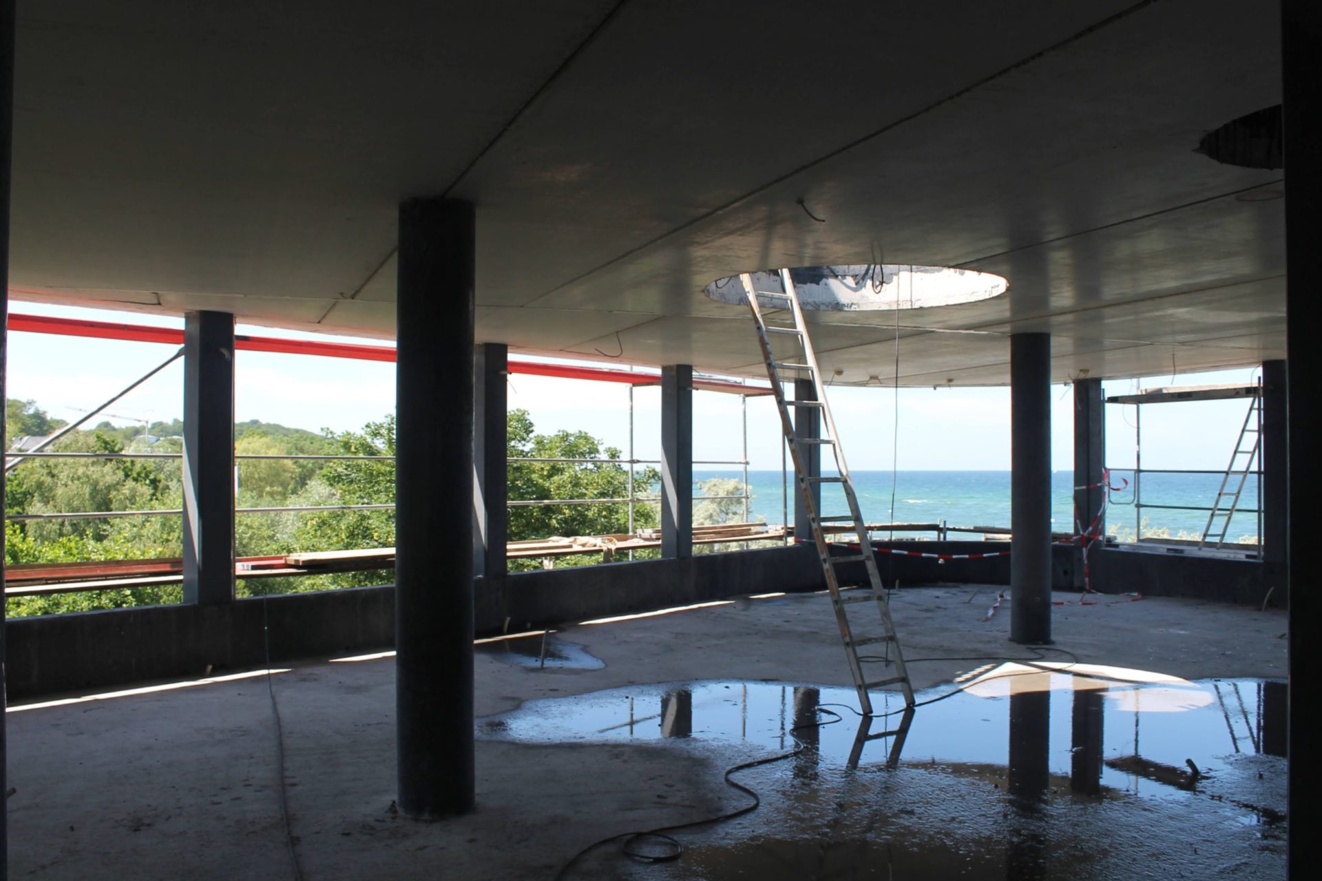 Während wir nach oben gingen, flog ein Vogel auf. Klaus König nannte seinen Namen (ich glaube Gartenrotschwanz) und sagte, dass er Glück bringen soll. Den Vogel hätte er wohl schon eher gebraucht. König schwärmte von den Sonnenuntergängen – gerade am Samstag war wieder so ein spektakulärer, der auf Instagram ganz oft zu sehen ist. Wir kletterten durch das Loch, durch das zwei Tage zuvor die Richtkrone schwebte. König war immer um meine Sicherheit bemüht – ich sollte vorgehen und beim Abstieg der Bauarbeiter vor mir herunter steigen, damit ich aufgefangen werden könnte. Oben standen wir erst einmal vor einer riesigen Badewanne, denn das Dach ist zwar dicht, aber noch nicht fertig, sodass die Notabläufe deutlich über der Betonplatte liegen. Die Sonne glitzerte in den Wellen, die vom doch recht frischen Wind gemacht wurden. Unten rauschte das Meer und König zeigte mir, was ihn so begeistert: