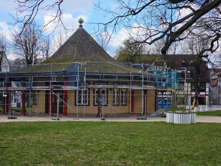 Nach dem Münster, der Backhausmühle und dem Gymnasium und dem – inzwischen abgebauten – Gerüst am Kurhotel hat nun auch der Rote Pavillon ein Baugerüst bekommen. Der 1809 als Erfrischungspavillon nach einem Vorbild in Altona gebaute damals so genannte „Trichter“ wird in den nächsten etwa zwei Wochen saniert.