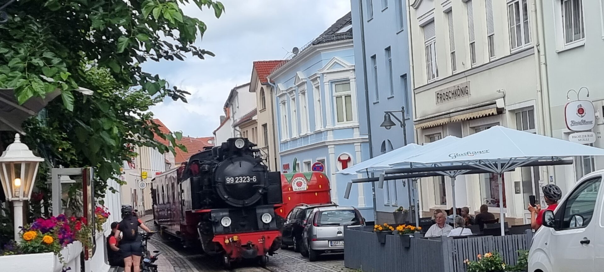 Die Fahrt mit dem Molli ist ein Erlebnis, bei dem man trocken bleibt. Für die ganze Strecke braucht man eine Dreiviertelstunde, in der jeglicher Regen einfach egal ist. Heiligendamm ist bei schlechtem Wetter nicht so interessant, außer wenn man sowieso gerade etwas essen möchte. Dann steigt man aus, kehrt im Herzoglichen Wartesaal ein und fährt mit einem späteren Zug weiter oder zurück.
