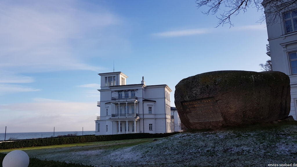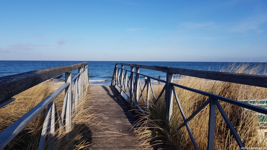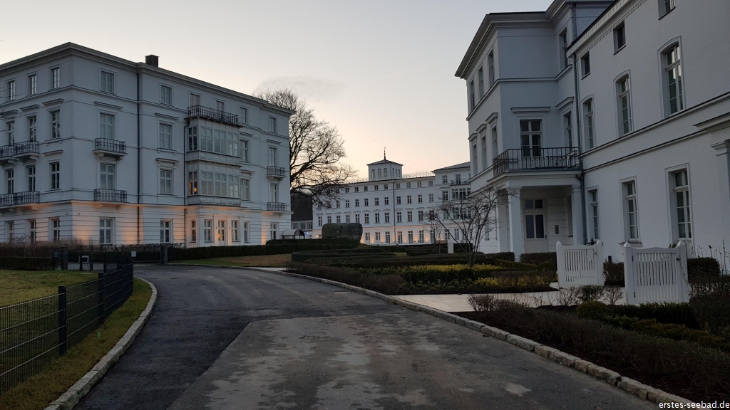 Wenn man von der Villa zum greifbar nahen Strand will, muss man entweder das Grand Hotel umrunden und am Findling auf die Promenade und zum Strand gehen oder man umrundet die ganze Perlenkette und nutzt den Strandzugang am Parkplatz, wie jeder andere auch. Das ist sinnig, da es zwischen den beiden Strandzugängen ohnehin nicht zum Strand geht, man also sowieso zur Seebrücke oder Eismilchbar laufen muss, um an den Strand zu kommen.