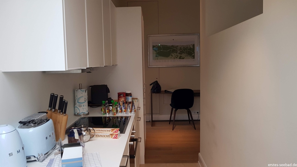 Die malerische Ausführung ist sehr präzise, die hohen Fußbodenleisten, die edlen Türen und Beschläge sehr wertig und zusammen mit der Designer-Ausstattung steht die Ferienwohnung dem Grand Hotel in nichts nach, wirkt aber viel leichter und moderner. So muss es früher hier auch gewesen sein, denn die Logierhäuser waren ja die sommerlichen Familiendomizile und das Grand Hotel die edle Luxusherberge.