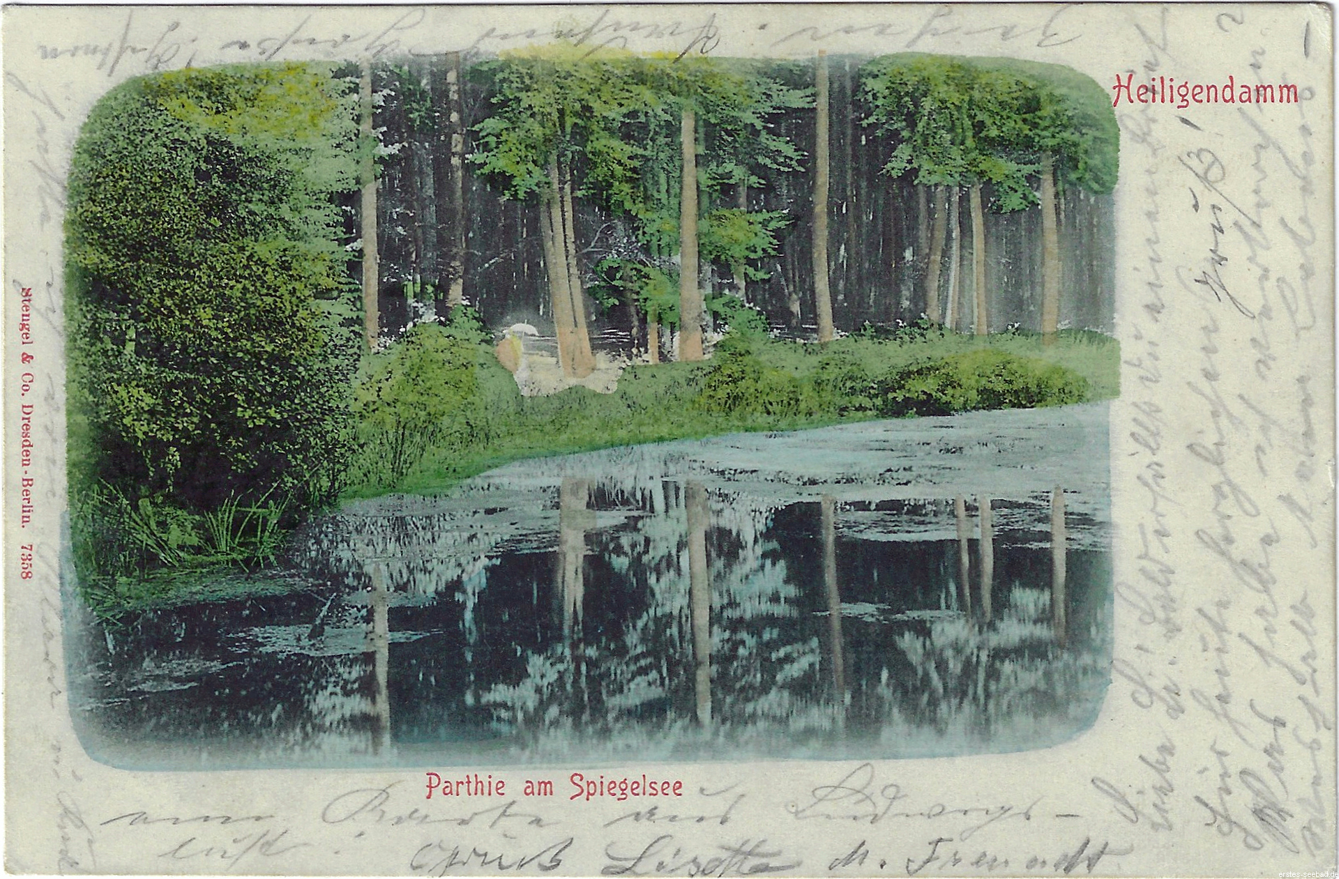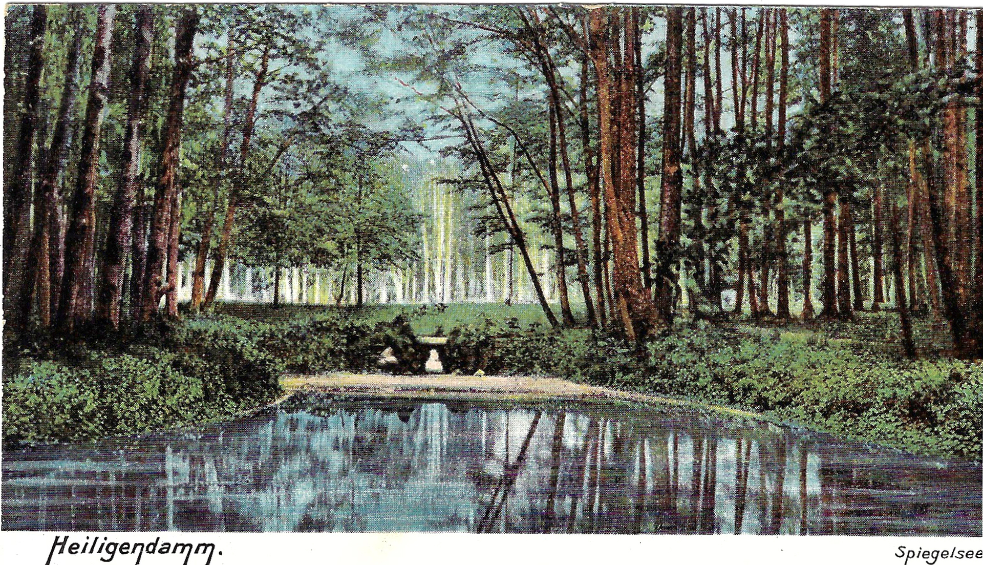Rainer Maria Rilke folgte einer Einladung seiner guten Freundin Helene von Nostiz an den Heiligen Damm, erholte sich dort vom 28.07. bis 16.08.1913. Rilke suchte neue Inspiration in einer schwierigen Phase. Der erste Eindruck war für ihn negativ. Das Bad war voller Menschen und er wollte wieder abreisen. Helene von Nostitz führte ihn in den ruhigeren Wald und zeigte ihm den Spiegelsee. Er schrieb von ihm inspiriert die Gedichte „Hinter schuldlosen Bäumen“ und „Waldsee“.