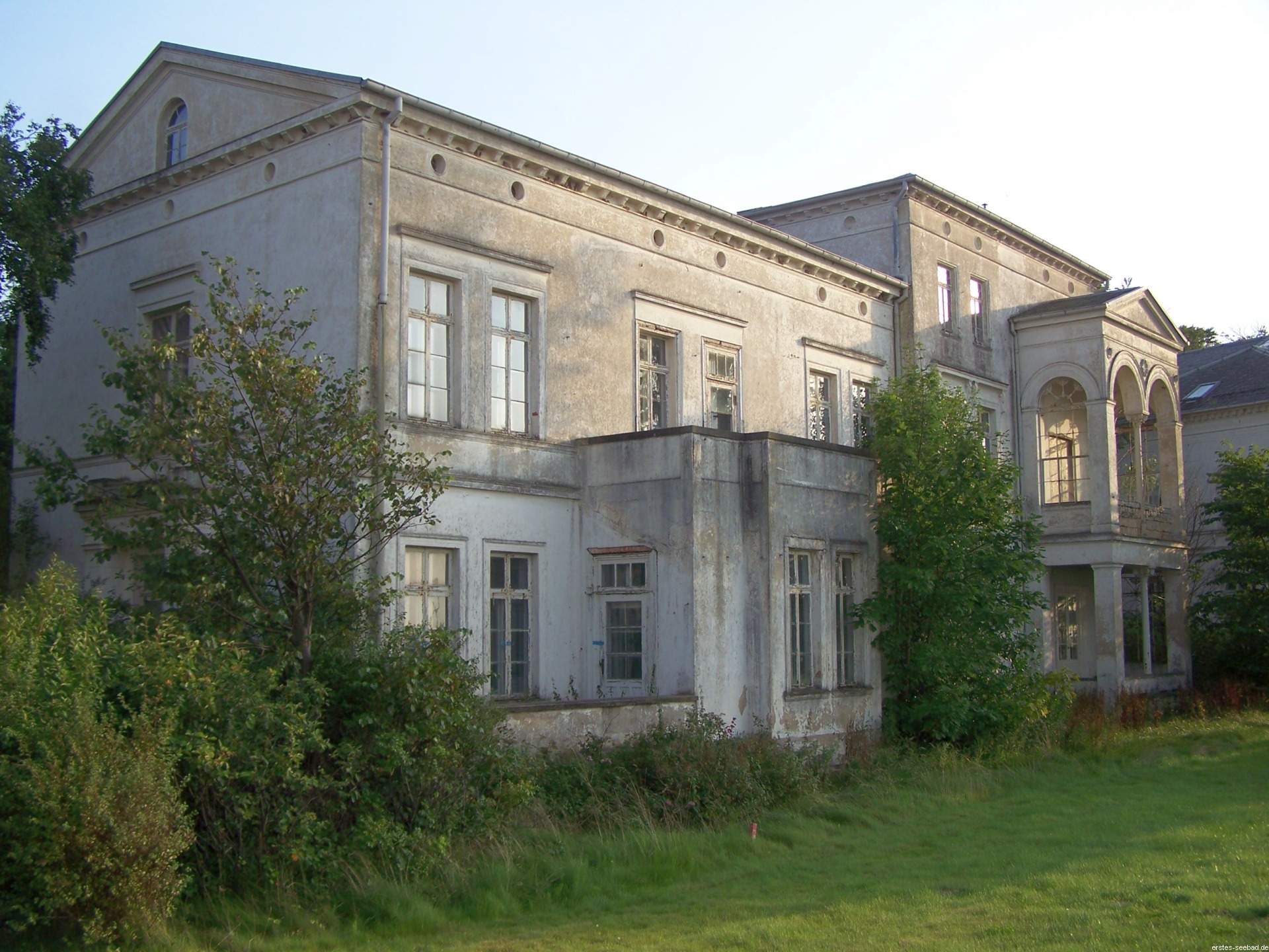 Nur im Ostgiebel findet man ein kleines Rundbogenfenster. Der flachere Bau hat in beiden Etagen je zwei Zwillingsfenster rechts und links seiner durch eine geschlossene Veranda mit Balkon und Baldachin dominierten Mitte. Im Erdgeschoss verschwinden die Fenster hinter einer offenen Veranda, von der man direkt in den Garten gelangte.
