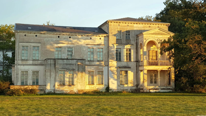 Nur im Ostgiebel findet man ein kleines Rundbogenfenster. Der flachere Bau hat in beiden Etagen je zwei Zwillingsfenster rechts und links seiner durch eine geschlossene Veranda mit Balkon und Baldachin dominierten Mitte. Im Erdgeschoss verschwinden die Fenster hinter einer offenen Veranda, von der man direkt in den Garten gelangte.