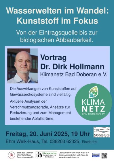 Dr. Dirk Hollmann, Vorstandsmitglied des Klimanetzes Bad Doberan, beleuchtet in seinem Vortrag die vielfältigen Auswirkungen von Kunststoffen auf Gewässerökosysteme – von der Eintragsquelle bis zur biologischen Abbaubarkeit. Dabei werden sowohl aktuelle Analysen der Verschmutzungsgrade als auch Ansätze zur Reduzierung und zum Management bestehender Abfallströme vorgestellt. Ein Fokus liegt auch auf Bad Doberan.
