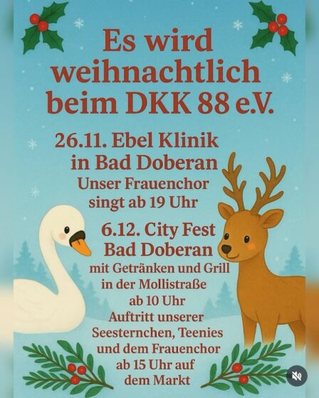 Veranstaltungsarchiv Weihnachten mit dem DKK 88 (26.11. und 06.12.2025) 25. 11 2025 Martin Dostal 0 Teilen mit: Auf Facebook teilen (Wird in neuem Fenster geöffnet) Facebook Auf Threads teilen (Wird in neuem Fenster geöffnet) Threads Auf X teilen (Wird in neuem Fenster geöffnet) X Auf Pinterest teilen (Wird in neuem Fenster geöffnet) Pinterest Drucken (Wird in neuem Fenster geöffnet) Drucken Einen Link per E-Mail an einen Freund senden (Wird in neuem Fenster geöffnet) E-Mail Auf WhatsApp teilen (Wird in neuem Fenster geöffnet) WhatsApp Doberaner Feuerwerk (25.02.2022)Datum18. 02 2022In Bezug aufVeranstaltungsarchivKrimi Freude zu Weihnachten (06.12.2025)Datum25. 11 2025In Bezug aufVeranstaltungsarchivTermine der Gottesdienste und Christvespern zu Weihnachten in Bad Doberan-Heiligendamm und AlthofDatum18. 12 2017In Bezug aufVeranstaltungsarchivAnzeige