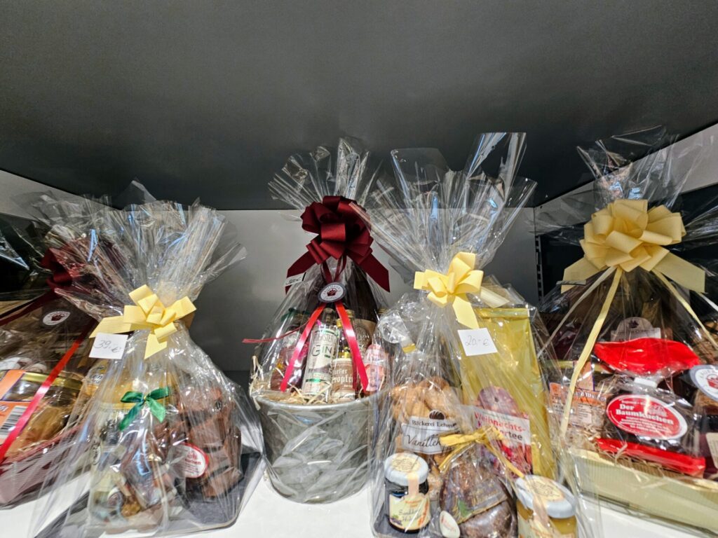 Eine hochprozentige Kleinigkeit gehört auch in jeden Präsentkorb. Absolut lokale und regionale Unikate gibt es bei Schollenberger und im Torhaus, sowie im Kaufmannsladen und im Getränkeland, Griechischen Wein finden Sie beim eben schon erwähnten KafeNeS in der Mollistraße und viele andere Weine bei Pallhuber gegenüber. Auch bei EDEKA und REWE und im Getränkeland finden Sie regionale Spirituosen.
